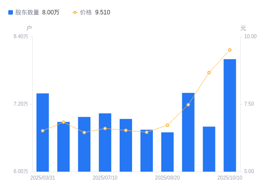 10月17日消息,数据显示,截至2025年9月19日,天富能源A股股东总户数为6.8万户,较上期(2025年9月10日)减少6000户,降幅8.11%。公司最新A股总股本为13.74亿股,其中流通A股13.74亿股,户均持有流通A股数量为2.02万股,较上期增加1638.79股,增幅8.82%;户均持流通A股市值17.52万元,较上期增加3.63万元,增幅26.14%。
