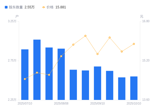 近一年(2024年10月10日至2025年10月10日),新宝股份A股股东户数从2.51万户,增加至2.55万户,增幅1.65%,区间股价上涨8.51%。