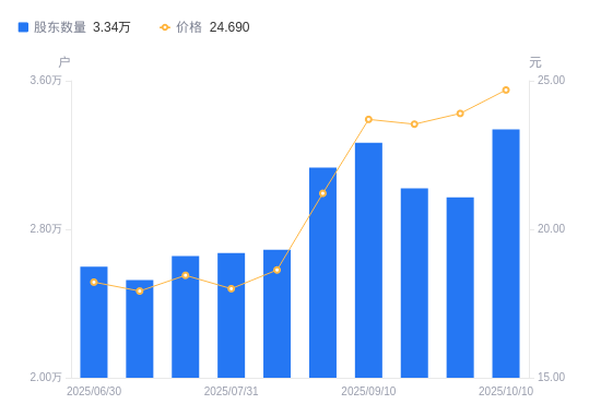 近一年(2024年10月10日至2025年10月10日),立中集团A股股东户数从2.4万户,增加至3.34万户,增幅38.97%,区间股价上涨39.38%。