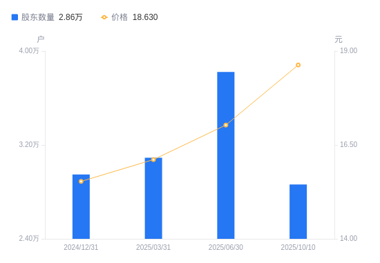 近一年(2024年12月31日至2025年10月10日),和胜股份A股股东户数从2.95万户,减低至2.86万户,降幅2.91%,区间股价上涨14.22%。