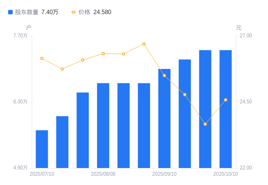 近一年(2024年10月10日至2025年10月10日),北新建材A股股东户数从4.8万户,增加至7.4万户,增幅54.17%,区间股价下跌13.56%。