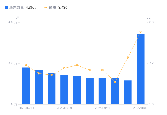 近一年(2024年10月10日至2025年10月10日),鼎信通讯A股股东户数从3.27万户,增加至4.35万户,增幅32.77%,区间股价上涨34.24%。