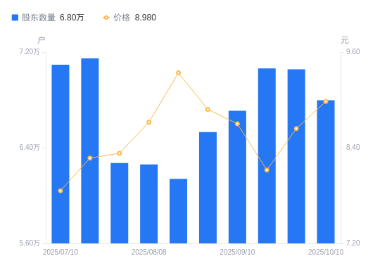 近一年(2024年10月10日至2025年10月10日),焦作万方A股股东户数从7.69万户,减低至6.8万户,降幅11.65%,区间股价上涨40.97%。