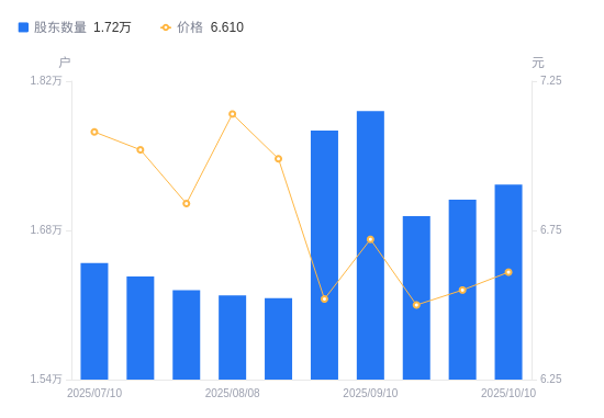 近一年(2024年10月18日至2025年10月10日),永安林业A股股东户数从1.96万户,减低至1.72万户,降幅12.02%,区间股价上涨19.31%。