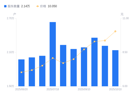 10月17日消息,数据显示,截至2025年9月30日,中新集团A股股东总户数为2.22万户,较上期(2025年9月19日)减少1431户,降幅6.07%。公司最新A股总股本为14.99亿股,其中流通A股14.99亿股,户均持有流通A股数量为6.76万股,较上期增加4102.2股,增幅6.46%;户均持流通A股市值63.37万元,较上期增加4.29万元,增幅7.26%。
