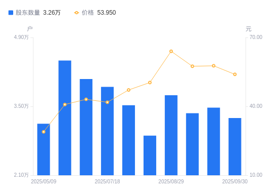 10月17日消息,数据显示,截至2025年9月30日,慧博云通A股股东总户数为3.26万户,较上期(2025年9月19日)减少2107户,降幅6.07%。公司最新A股总股本为4.04亿股,其中流通A股2.43亿股,户均持有流通A股数量为7442.5股,较上期增加451.47股,增幅6.46%;户均持流通A股市值40.15万元,较上期减少1719.75元,降幅0.43%。