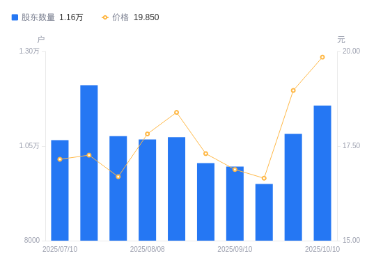 10月17日消息,数据显示,截至2025年10月10日,宁波色母A股股东总户数为1.16万户,较上期(2025年9月30日)增加750户,增幅6.93%。公司最新A股总股本为1.68亿股,其中流通A股1.11亿股,户均持有流通A股数量为9631.54股,较上期减少667.44股,降幅6.48%;户均持流通A股市值19.12万元,较上期减少4185.5元,降幅2.14%。