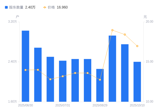 10月17日消息,数据显示,截至2025年10月10日,科新机电A股股东总户数为2.4万户,较上期(2025年9月20日)减少3519户,降幅12.80%。公司最新A股总股本为2.74亿股,其中流通A股2.1亿股,户均持有流通A股数量为8752.45股,较上期增加1120.12股,增幅14.68%;户均持流通A股市值14.84万元,较上期增加8006.64元,增幅5.70%。