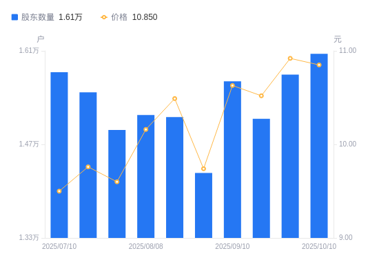 近一年(2024年10月18日至2025年10月10日),泰瑞机器A股股东户数从1.7万户,减低至1.61万户,降幅5.50%,区间股价上涨39.10%。