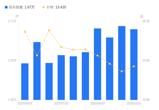 近一年(2024年10月10日至2025年10月10日),武汉天源A股股东户数从2.03万户,减低至1.67万户,降幅17.70%,区间股价上涨34.20%。