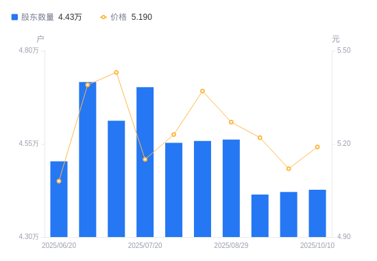 近一年(2024年10月20日至2025年10月10日),华锦股份A股股东户数从5.08万户,减低至4.43万户,降幅12.90%,区间股价上涨22.93%。