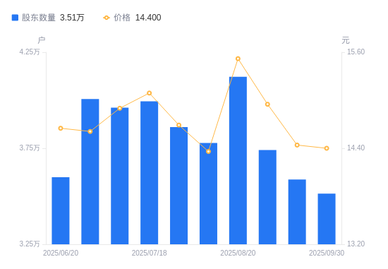 近一年(2024年9月30日至2025年9月30日),皇台酒业A股股东户数从4.44万户,减低至3.51万户,降幅20.84%,区间股价上涨8.84%。
