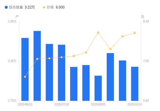 10月14日消息,数据显示,截至2025年10月10日,罗平锌电A股股东总户数为3.22万户,较上期(2025年9月10日)减少955户,降幅2.88%。公司最新A股总股本为3.23亿股,其中流通A股3.23亿股,户均持有流通A股数量为1.01万股,较上期增加290.14股,增幅2.97%;户均持流通A股市值8.05万元,较上期增加3493.26元,增幅4.54%。