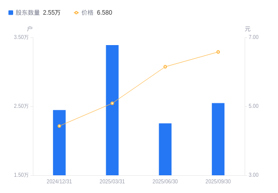 近一年(2024年9月30日至2025年9月30日),合金投资A股股东户数从2.84万户,减低至2.55万户,降幅10.20%,区间股价上涨39.41%。