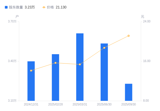 近一年(2024年9月30日至2025年9月30日),川金诺A股股东户数从3.5万户,减低至3.23万户,降幅7.85%,区间股价上涨76.08%。
