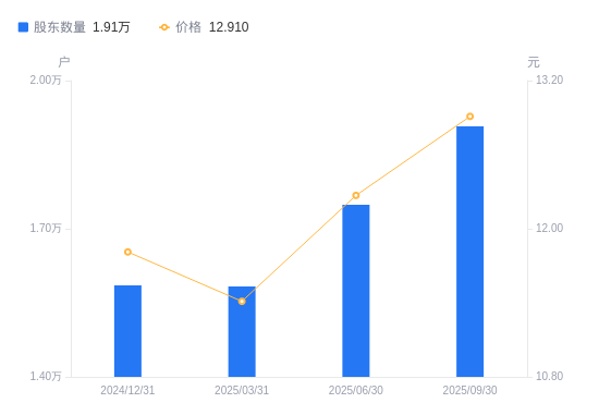 近一年(2024年9月30日至2025年9月30日),山河药辅A股股东户数从1.57万户,增加至1.91万户,增幅21.38%,区间股价上涨12.44%。