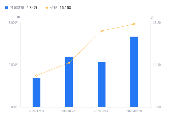 近一年(2024年9月30日至2025年9月30日),物产金轮A股股东户数从2.76万户,增加至2.84万户,增幅2.63%,区间股价上涨15.18%。