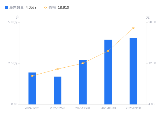 近一年(2024年9月30日至2025年9月30日),电工合金A股股东户数从1.92万户,增加至4.05万户,增幅111.27%,区间股价上涨130.38%。