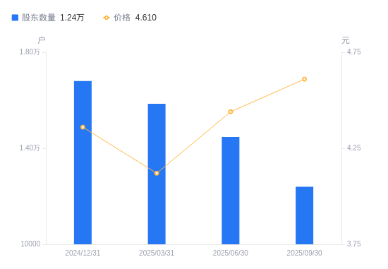 近一年(2024年9月30日至2025年9月30日),*ST天喻A股股东户数从1.84万户,减低至1.24万户,降幅32.71%,区间股价下跌7.62%。
