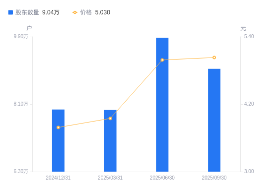 近一年(2024年9月30日至2025年9月30日),晋西车轴A股股东户数从8.24万户,增加至9.04万户,增幅9.72%,区间股价上涨40.66%。