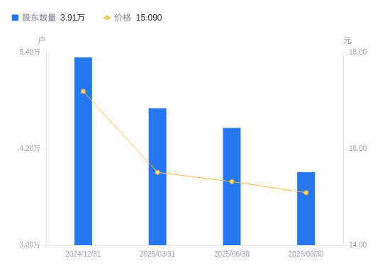 近一年(2024年9月30日至2025年9月30日),五方光电A股股东户数从5.17万户,减低至3.91万户,降幅24.39%,区间股价上涨8.94%。