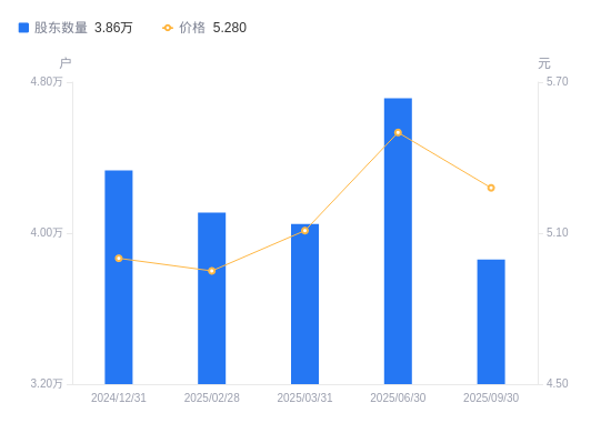 近一年(2024年9月30日至2025年9月30日),中电环保A股股东户数从4.67万户,减低至3.86万户,降幅17.39%,区间股价上涨10.69%。