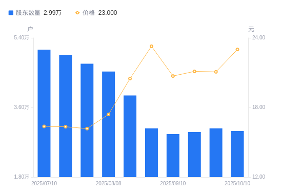 近一年(2024年10月10日至2025年10月10日),伊戈尔A股股东户数从3.42万户,减低至2.99万户,降幅12.52%,区间股价上涨16.33%。