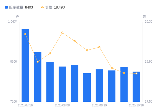 10月20日消息,数据显示,截至2025年9月30日,深圳瑞捷A股股东总户数为8594户,较上期(2025年9月19日)增加142户,增幅1.68%。公司最新A股总股本为1.52亿股,其中流通A股9480.22万股,户均持有流通A股数量为1.1万股,较上期减少185.33股,降幅1.65%;户均持流通A股市值20.42万元,较上期减少5337.32元,降幅2.55%。