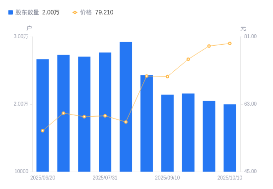 近一年(2024年10月10日至2025年10月10日),精测电子A股股东户数从2.05万户,减低至2万户,降幅2.59%,区间股价上涨13.17%。