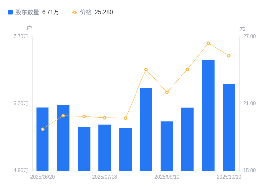 近一年(2024年10月10日至2025年10月10日),飞凯材料A股股东户数从4.47万户,增加至6.71万户,增幅50.11%,区间股价上涨64.10%。