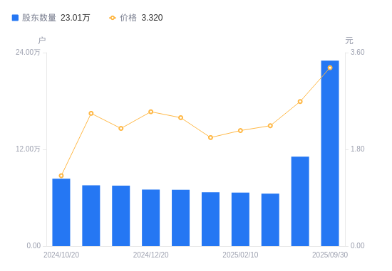 近一年(2024年9月30日至2025年9月30日),合力泰A股股东户数从8.94万户,增加至23.01万户,增幅157.50%,区间股价上涨149.62%。