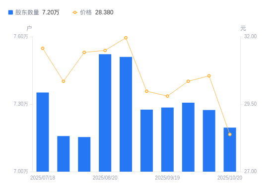 近一年(2024年10月31日至2025年10月20日),光威复材A股股东户数从5.65万户,增加至7.2万户,增幅27.28%,区间股价下跌17.61%。