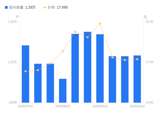 近一年(2024年10月10日至2025年10月10日),久祺股份A股股东户数从1.07万户,增加至1.29万户,增幅21.01%,区间股价上涨61.70%。