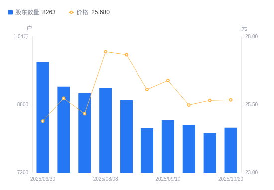 近一年(2024年12月20日至2025年10月20日),研奥股份A股股东户数从9971户,减低至8263户,降幅17.13%,区间股价上涨22.27%。