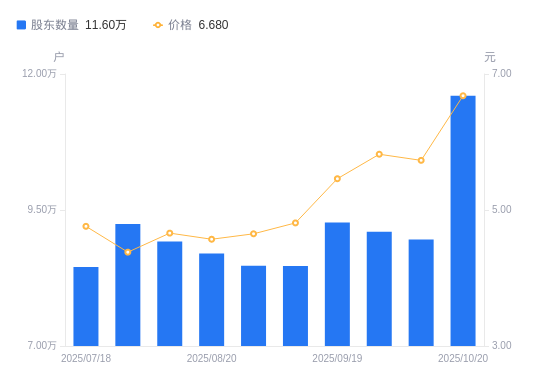 近一年(2024年11月20日至2025年10月20日),海马汽车A股股东户数从10.25万户,增加至11.6万户,增幅13.23%,区间股价上涨44.59%。