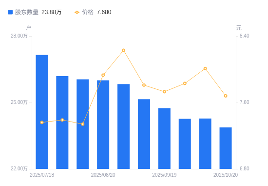 近一年(2024年10月31日至2025年10月20日),第一创业A股股东户数从24.12万户,减低至23.88万户,降幅0.99%,区间股价下跌0.72%。