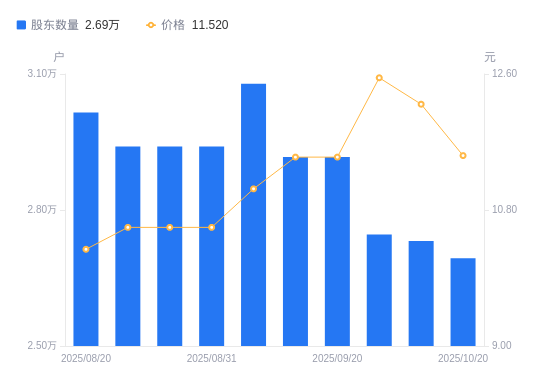 近一年(2024年10月31日至2025年10月20日),滨江集团A股股东户数从4.18万户,减低至2.69万户,降幅35.50%,区间股价上涨20.03%。