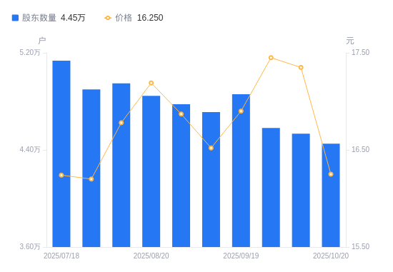 近一年(2024年10月31日至2025年10月20日),博实股份A股股东户数从3.15万户,增加至4.45万户,增幅41.33%,区间股价上涨13.48%。