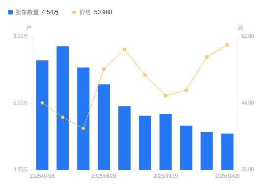 近一年(2024年12月31日至2025年10月20日),常山药业A股股东户数从3.92万户,增加至4.54万户,增幅15.86%,区间股价上涨154.01%。