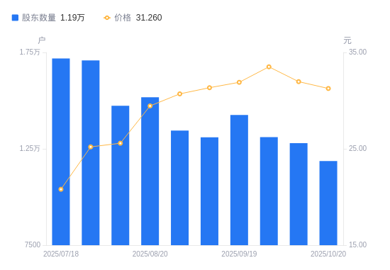近一年(2024年10月31日至2025年10月20日),洁美科技A股股东户数从1.76万户,减低至1.19万户,降幅32.42%,区间股价上涨47.70%。