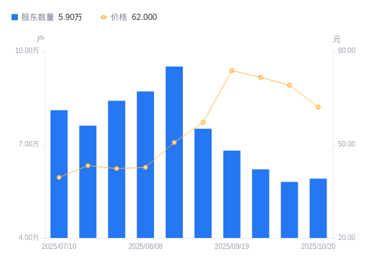 近一年(2024年11月20日至2025年10月20日),科华数据A股股东户数从5.6万户,增加至5.9万户,增幅5.36%,区间股价上涨155.04%。