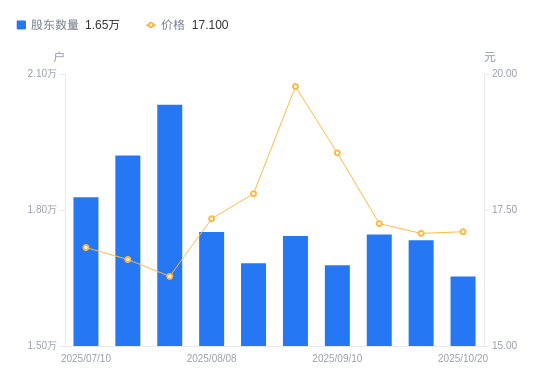 近一年(2024年10月31日至2025年10月20日),新乳业A股股东户数从1.93万户,减低至1.65万户,降幅14.24%,区间股价上涨49.93%。