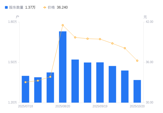 近一年(2024年10月31日至2025年10月20日),博硕科技A股股东户数从1.53万户,减低至1.37万户,降幅10.66%,区间股价上涨18.99%。
