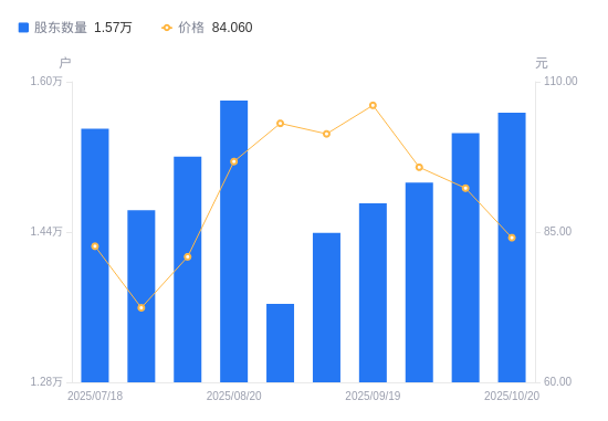 近一年(2024年11月8日至2025年10月20日),唯科科技A股股东户数从1.79万户,减低至1.57万户,降幅12.23%,区间股价上涨143.44%。