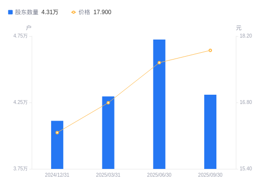 10月21日消息,数据显示,截至2025年9月30日,天银机电A股股东总户数为4.31万户,较上期(2025年6月30日)减少4158户,降幅8.80%。公司最新A股总股本为4.25亿股,其中流通A股4.19亿股,户均持有流通A股数量为9720.07股,较上期增加855.47股,增幅9.65%;户均持流通A股市值17.4万元,较上期增加1.76万元,增幅11.27%。