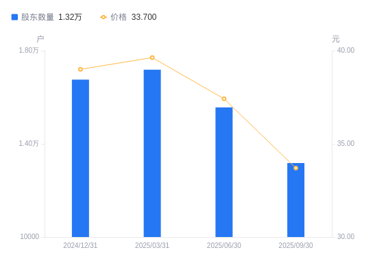 近一年(2024年9月30日至2025年9月30日),双乐股份A股股东户数从1.83万户,减低至1.32万户,降幅27.97%,区间股价上涨3.09%。