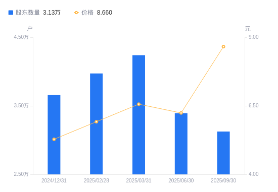 近一年(2024年9月30日至2025年9月30日),毅昌科技A股股东户数从4.01万户,减低至3.13万户,降幅22.05%,区间股价上涨60.97%。