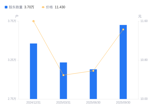近一年(2024年9月30日至2025年9月30日),全聚德A股股东户数从3.51万户,增加至3.7万户,增幅5.54%,区间股价上涨17.47%。