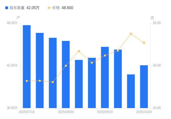 近一年(2024年10月31日至2025年10月20日),中兴通讯A股股东户数从44.76万户,减低至42.05万户,降幅6.05%,区间股价上涨64.01%。