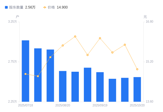 近一年(2024年10月31日至2025年10月20日),新宝股份A股股东户数从2.88万户,减低至2.56万户,降幅11.23%,区间股价上涨3.29%。